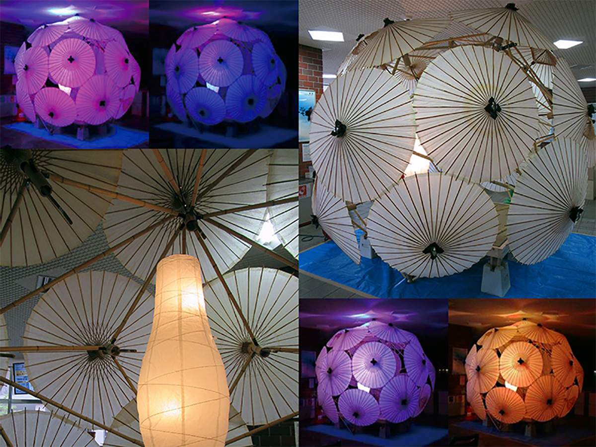 本プロジェクトでは、住居・インテリア設計学科2年生が一坪の茶室4「斜堂(SHADOW)」を設計し、ワークショップとして同1年生や体験入学の高校生とその製作を行ったものです。≪見渡せば 花も紅葉も なかりけり 浦の苫屋の 秋の夕暮れ≫この和歌は、藤原定家が新古今和歌集に寄せたもので、千利休が侘び茶の精神を象徴すると好んだ和歌だと伝えられています。茶室の天井はこの和歌の文字が彫られており、ここを通過する光で和歌が床に映り込み内部空間を演出します。作品製作は林野庁新たな木材需要創出総合事業に参画し、日本産業技術教育学会特別賞を受賞しました。