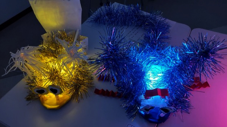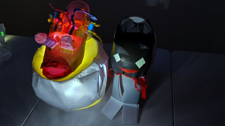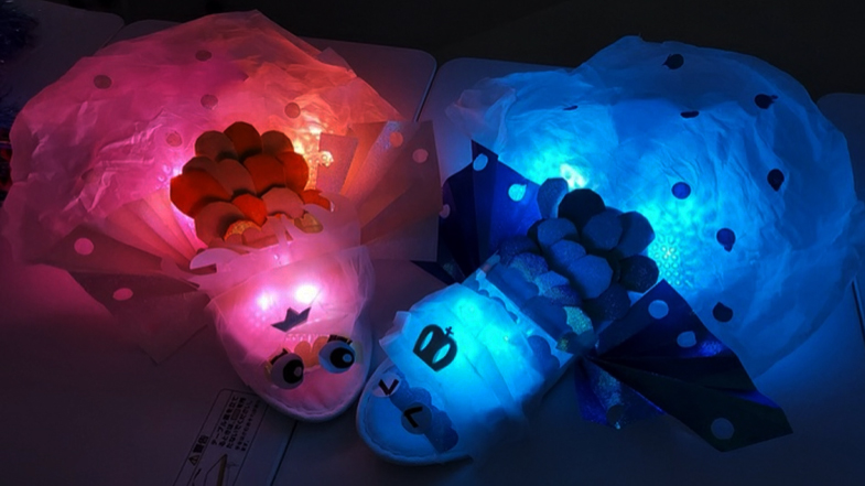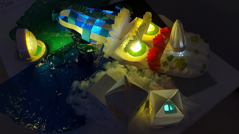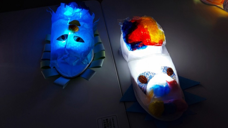造形表現の主材料は紙です。不織布スリッパの他、トレーシングペーパーや和紙の光の透過感、画用紙やケント紙、段ボールの光の反射感・遮蔽感を楽しみ・苦しみながら、見立てた生物を表現しました。