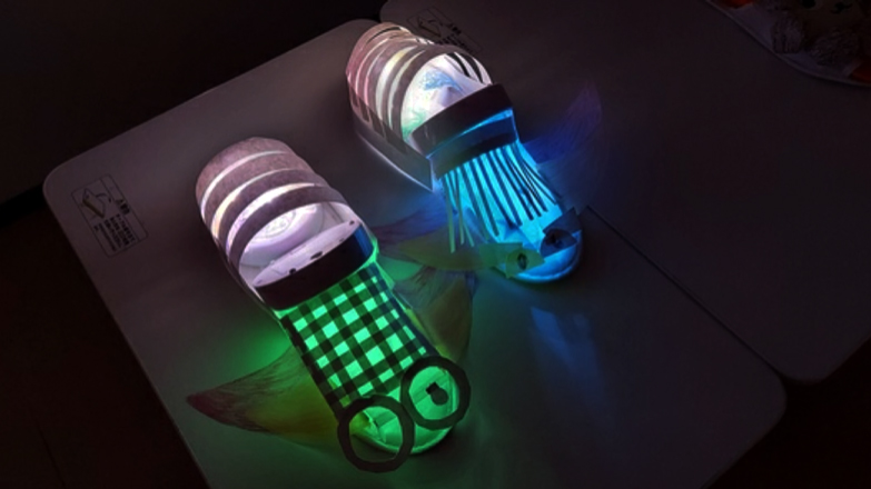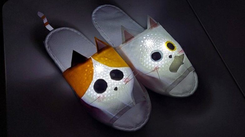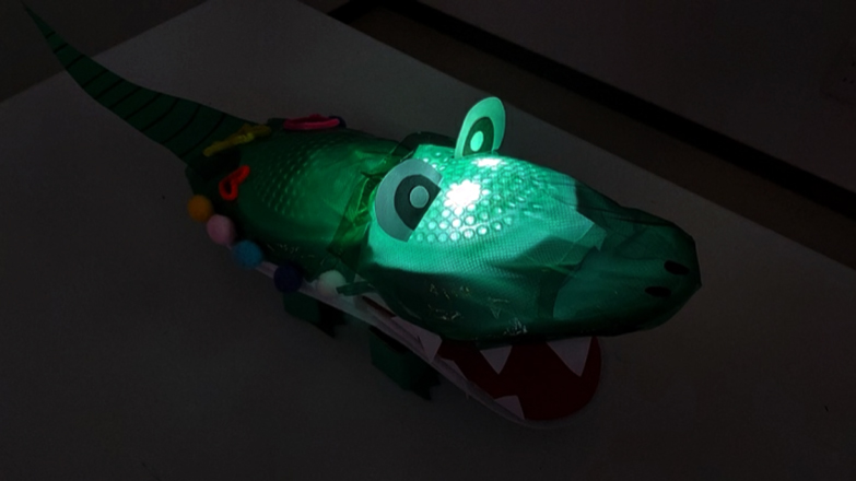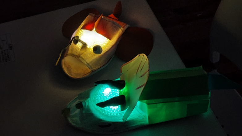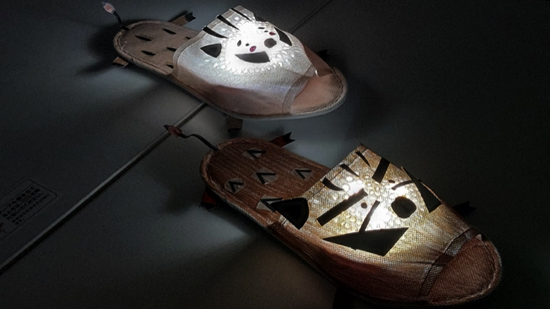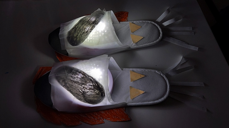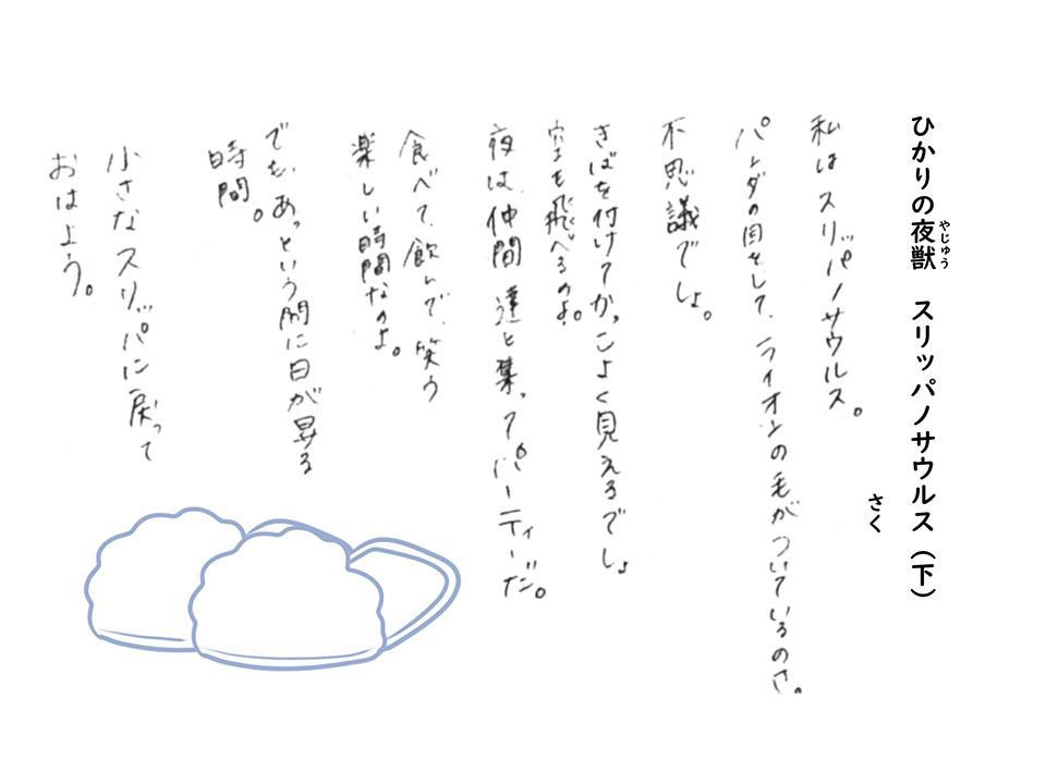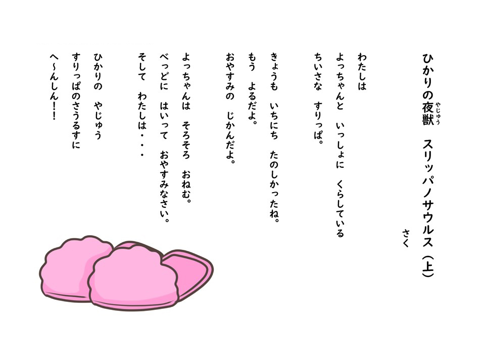 この教材はデフォルトとして、不織布スリッパを架空の光る生物に見立てて、その造形表現を試みたものです。昼間は小さな女の子が履いているスリッパを主人公とした共通の題材童話(上=緒言)が、教材に付いています。造形と同時に、夜間に変身して活動を開始するスリッパノサウルスが主人公の創作童話(下=結言)も執筆しました【題材・創作童話は拡大可】。