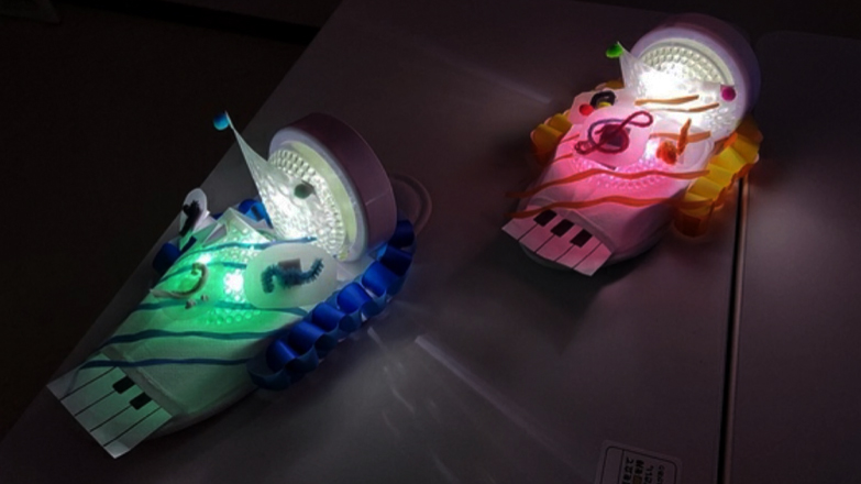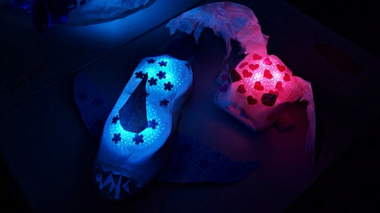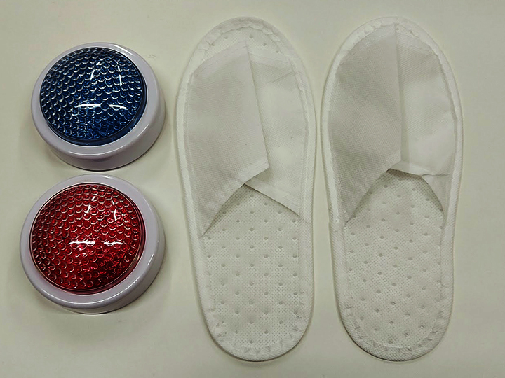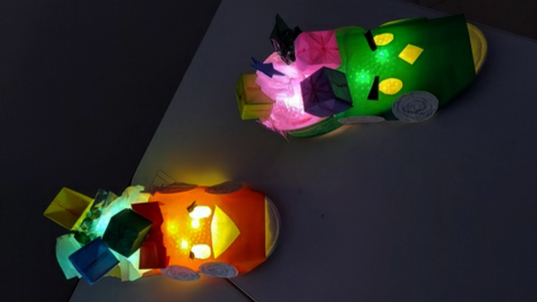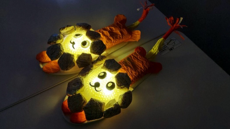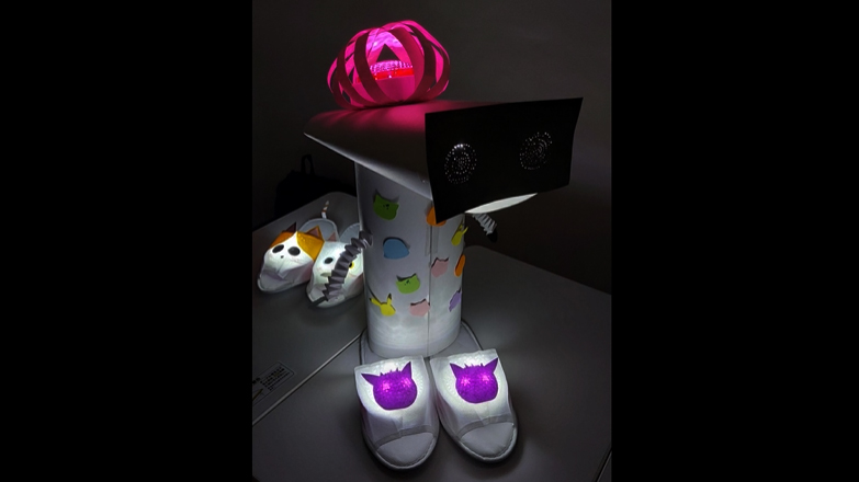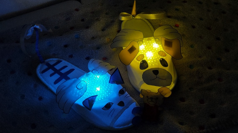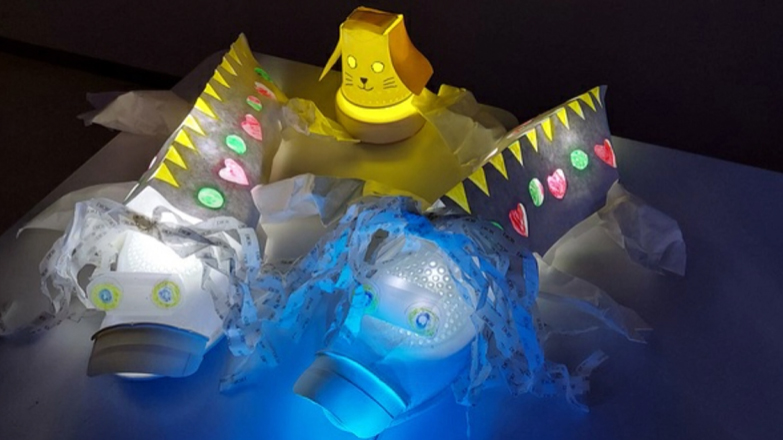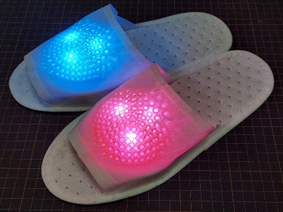 この教材はデフォルトとして、不織布スリッパを架空の光る生物に見立てて、その造形表現を試みたものです。昼間は小さな女の子が履いているスリッパを主人公とした共通の題材童話(上=緒言)が、教材に付いています。造形と同時に、夜間に変身して活動を開始するスリッパノサウルスが主人公の創作童話(下=結言)も執筆しました【題材・創作童話は拡大可】。