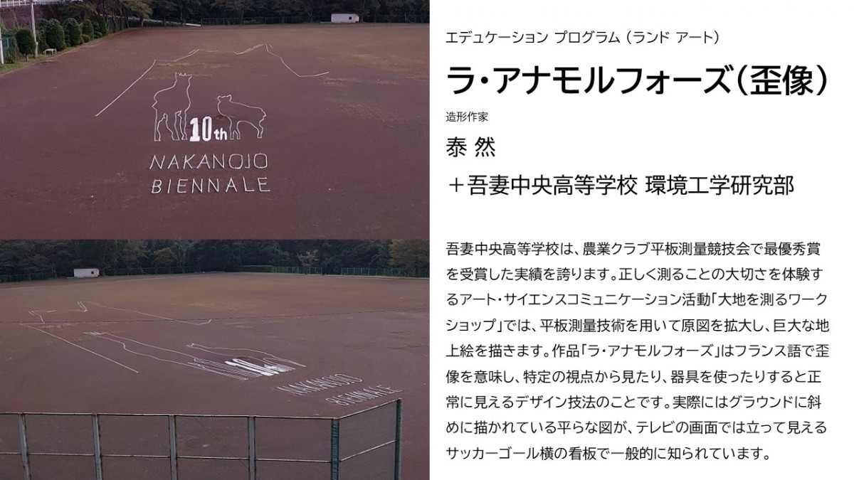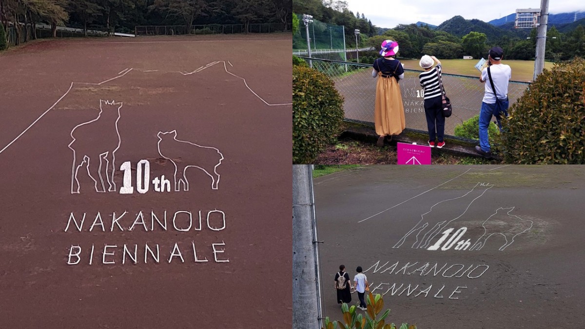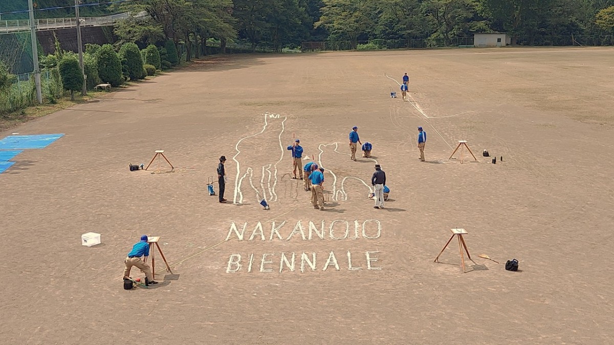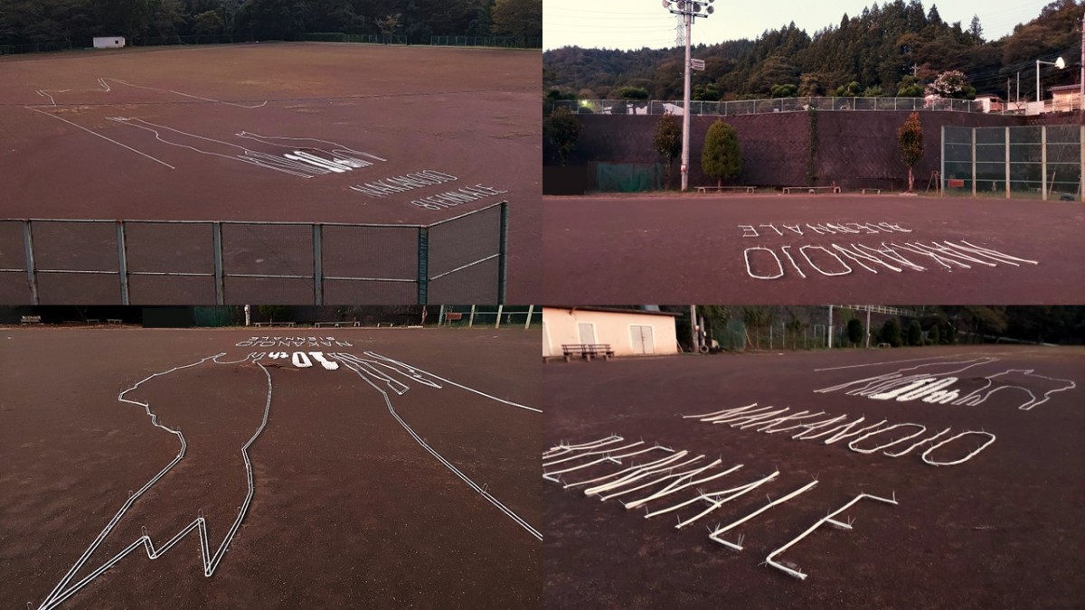 一方、前述のような一日限りのイベントではなく、一か月に及ぶ芸術祭期間の展示に対応できる工夫が求められました。主催者から制作場として充てられた旧中之条町立西中学校は廃校ではあるものの、グラウンドは日頃から町民のレクリエーションに利用されているため全面は使えず、国道353号線側から3分の1程度の、幅約38m、長さ約123mの細長い長方形が芸術祭で使用可能な範囲とされました。なお国道とグラウンドには約8mの高低差がありました。またドローン等による上空からの俯瞰映像ではなく、地上で来場者が常に鑑賞できる作品にしなければならないことなどから、「ラ・アナモルフォーズ(歪像地上絵)」の着想に至りました。