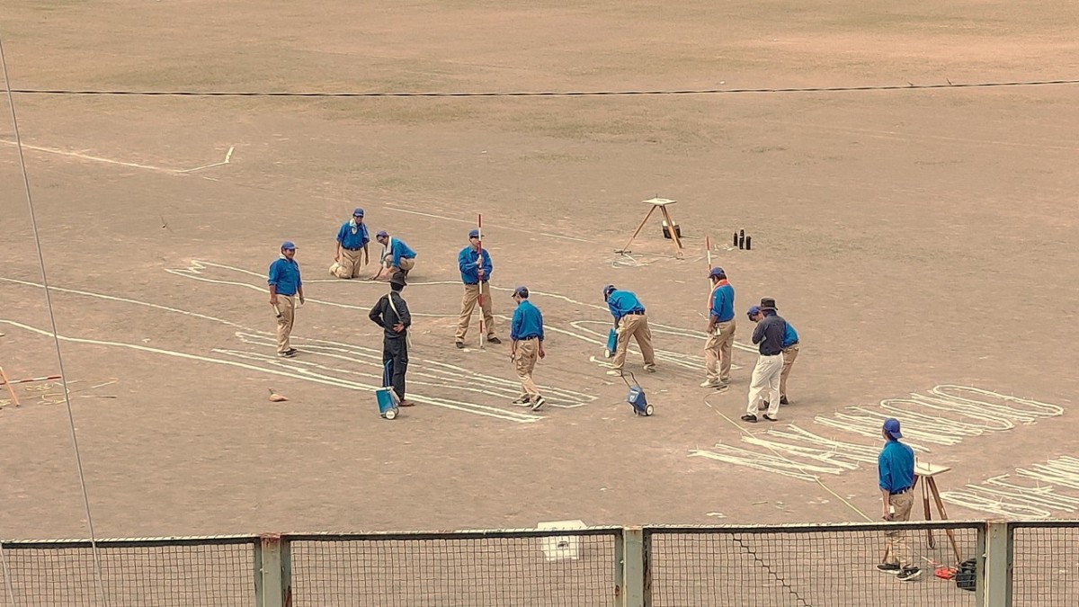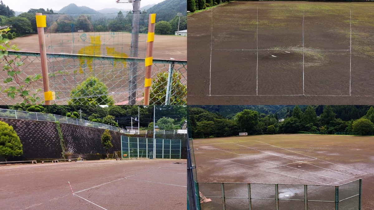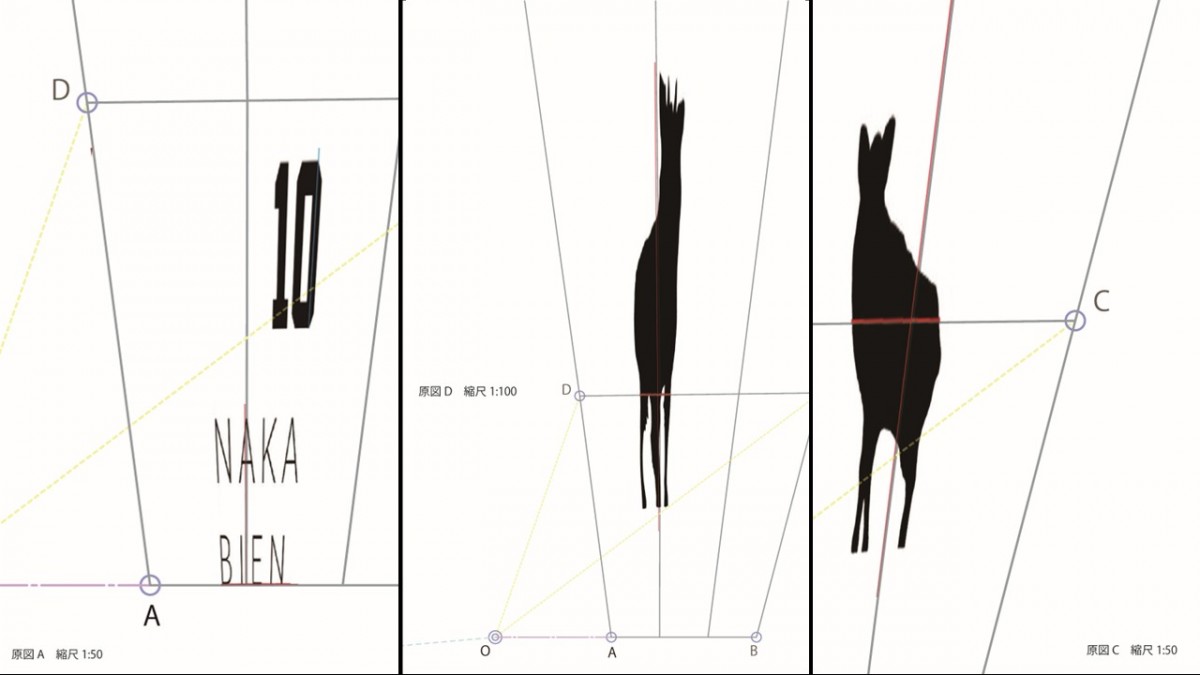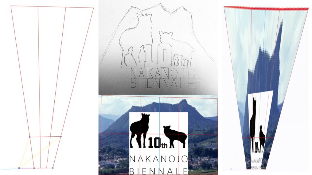 一方、前述のような一日限りのイベントではなく、一か月に及ぶ芸術祭期間の展示に対応できる工夫が求められました。主催者から制作場として充てられた旧中之条町立西中学校は廃校ではあるものの、グラウンドは日頃から町民のレクリエーションに利用されているため全面は使えず、国道353号線側から3分の1程度の、幅約38m、長さ約123mの細長い長方形が芸術祭で使用可能な範囲とされました。なお国道とグラウンドには約8mの高低差がありました。またドローン等による上空からの俯瞰映像ではなく、地上で来場者が常に鑑賞できる作品にしなければならないことなどから、「ラ・アナモルフォーズ(歪像地上絵)」の着想に至りました。