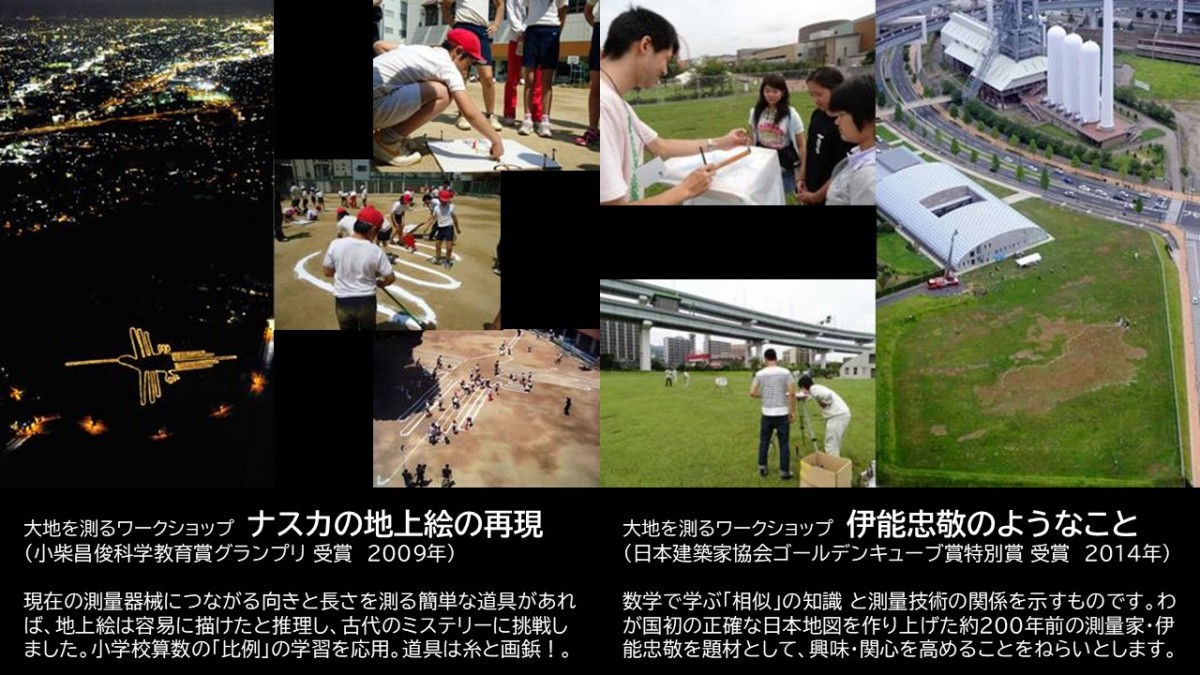 応募者はこれまで、 正しく測ることの大切さを体験するアート・サイエンスコミュニケーション活動「大地を測るワークショップ」として、測量技術を用い原図を拡大し、 巨大地上絵を描いてきました。事例:「ナスカの地上絵の再現」(2009年~)、「伊能忠敬のようなこと」(2014年~)。 ただしそれは、地上絵上空のドローンや取材ヘリコプターから見下ろす、実践日一日限りのイベントでした。