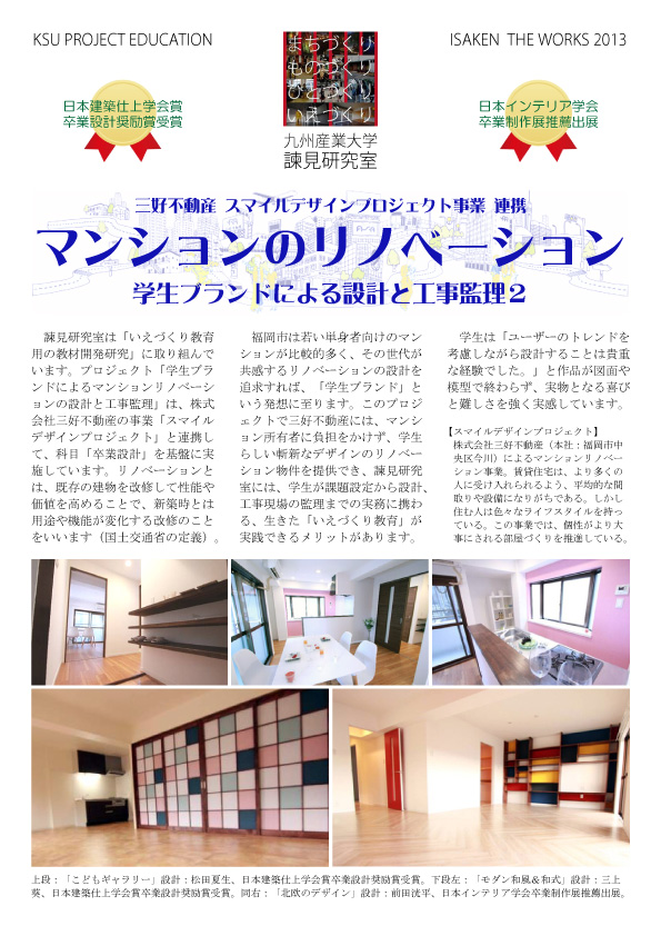 諫見研究室は「いえづくり教育用の教材開発研究」に取り組んでいます。プロジェクト「学生ブランドによるマンションリノベーションの設計と工事監理」は、株式会社三好不動産の事業「スマイルデザインプロジェクト」と連携して、科目「卒業設計」を基盤に実施しています。リノベーションとは、既存の建物を改修して性能や価値を高めることで、新築時とは用途や機能が変化する改修のことをいいます(国土交通省の定義)。