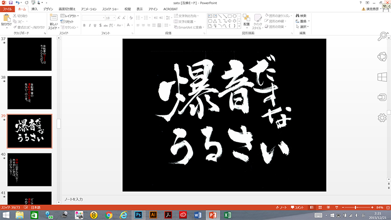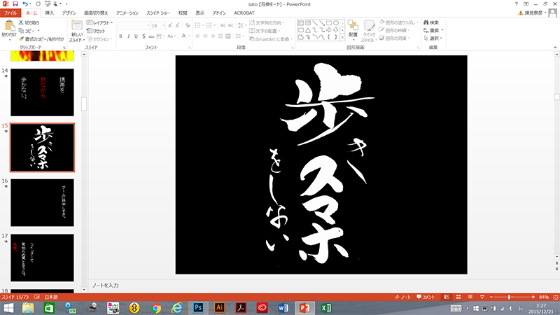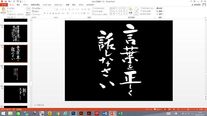 そもそもこの作品は、自分のためになるのに、お年寄りに叱られる機会がなかなかない。マナーが悪い大学生に気合を入れてもらいたい。若い世代に向けたお年寄りの言葉が、学生の心に一言でも突き刺さってもらえれば。そんな思いから私が企画したものでした。まず東区美和台公民館の協力を得て、お年寄りから言葉を募集しました。そこで集まった「若者よ、働いてくれ」、「言葉を正しく話しなさい」、「人前で化粧をしない」、「歩きスマホをしない」、「笑われてもいい 大きな夢をもて」、「人前で化粧をしない」、「駅の路地に座るな」など73の言葉を、老人会の書道クラブの皆さんに力強い毛筆で書いていただきました。