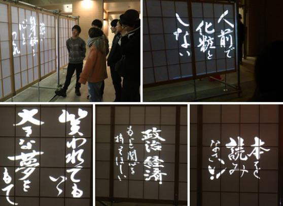 お年寄りから寄せられた、若者を叱り、励ますこれらの言葉は、12月11日、12日の午後5時すぎから、縦2m、横6mの障子にリア投影(背面投影)で浮かび上がりました。人生の大先輩から喝を入れられたかたちの多くの学生たちが、興味深そうにプロジェクションマッピングに見入り、「自分に当てはまる言葉があり、今後気をつけたいと思った」、「お年寄りが自分たちのことをこれだけ考えて言葉をくれたのがうれしい」、「普段、お年寄りと接する機会がないので、若者に対して思っていることをストレートに伝える演出は印象に残った」などの感想を話してくれました。