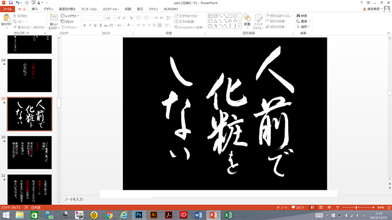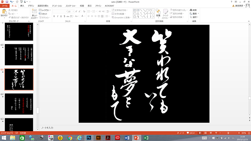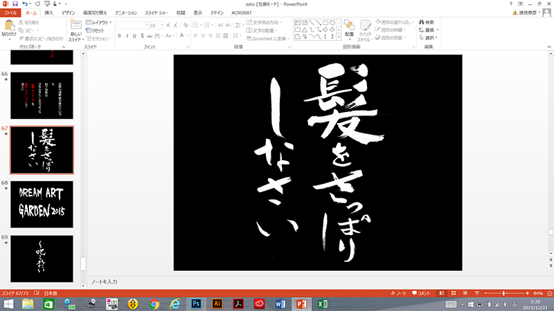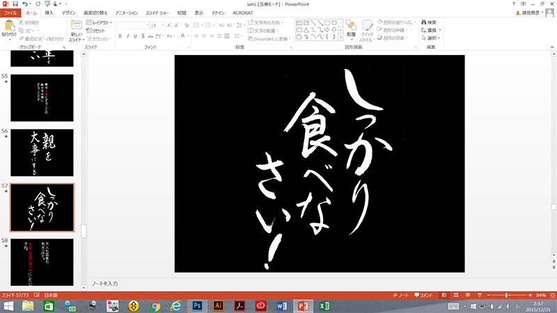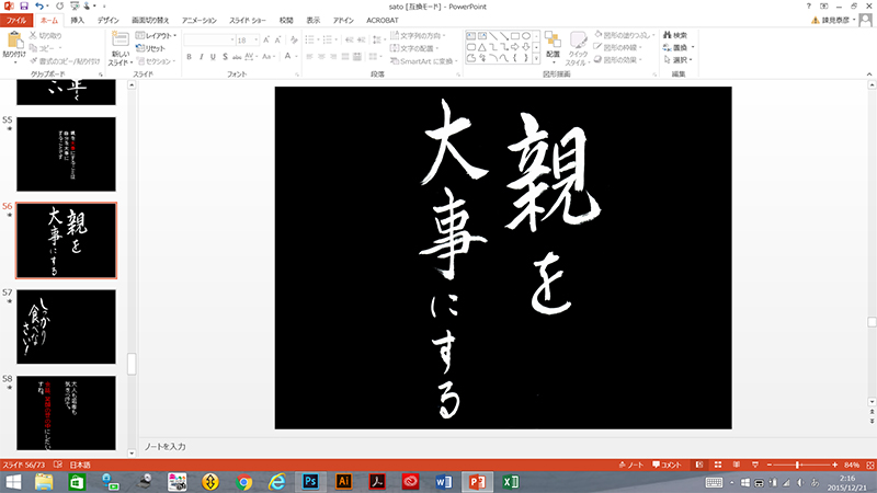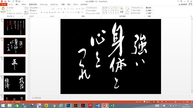 福岡市東区美和台公民館老人会書道クラブの皆さんが参画した本作品(プロジェクションマッピングの映像コンテンツ)は、PowerPoint を使って制作しました。リア プロジェクションマッピングは、映像の対象物への背面投影です。障子という建具、和紙という素材を対象物に実演したものです。