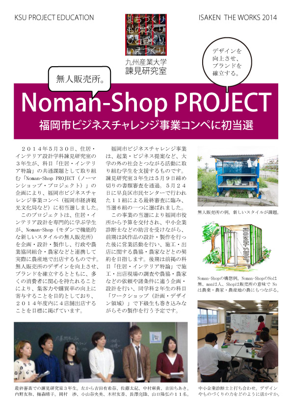 2014年5月30日、住居・インテリア設計学科諫見研究室の3年生が、科目「住居・インテリア特論」の共通課題として取り組む「Noman-Shop PROJECT(ノーマンショップ・プロジェクト)」の企画により、福岡市ビジネスチャレンジ事業コンペ(福岡市経済観光文化局)に当選しました。