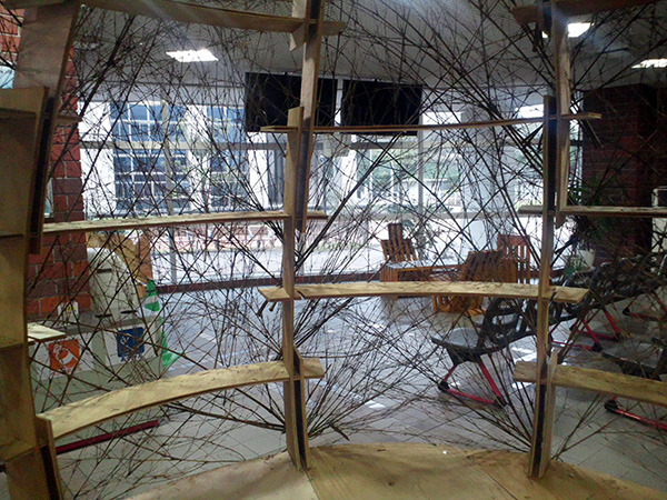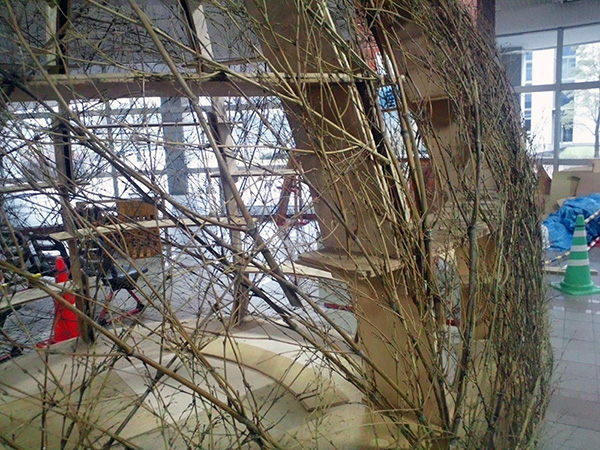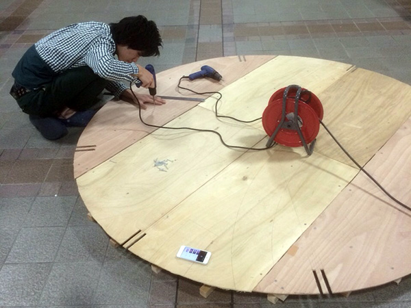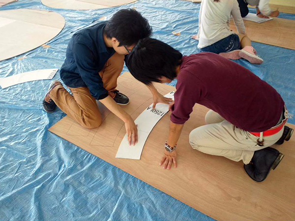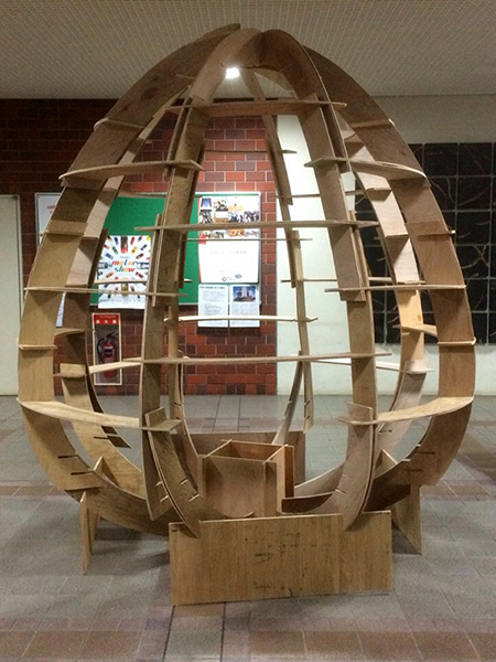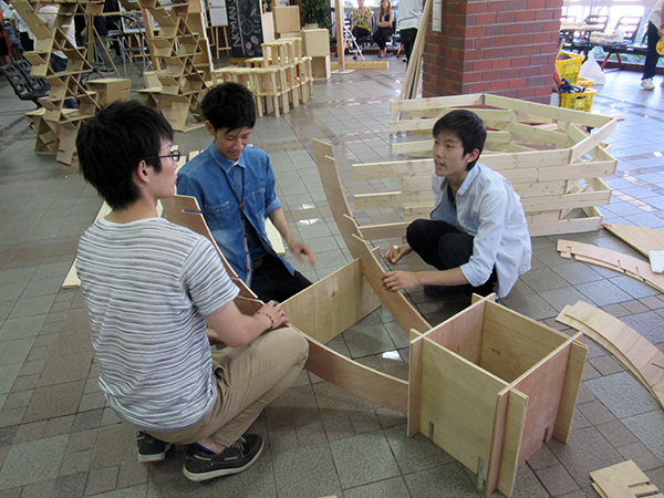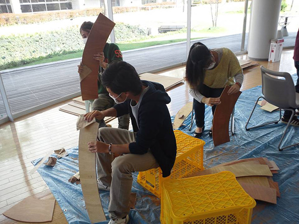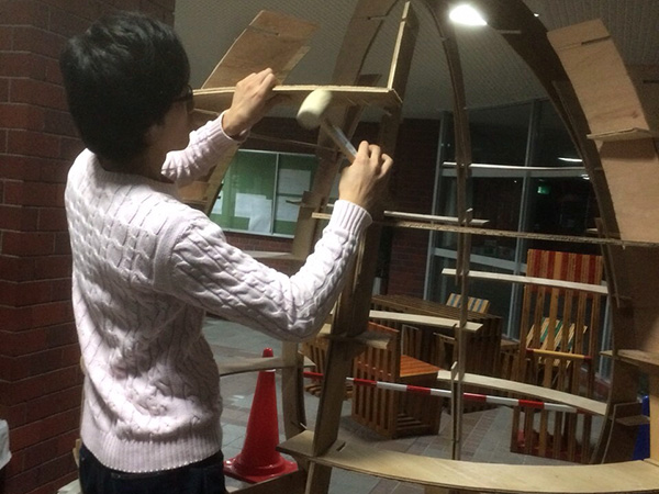 また型紙小建築の部材は全て長さ1m以内のベニヤ板であるため、建築物の解体時にはコンパクトにまとめることができ、部材の保管・運搬が容易であることが分かりました。さらに厚さ5mm のベニヤ板を使用するため、のこぎりでほぼ自由自在に加工でき、例えば本作品で取り扱った、卵形のような曲線・曲面を多用する建築物を建てることにも適していることが分かりました。