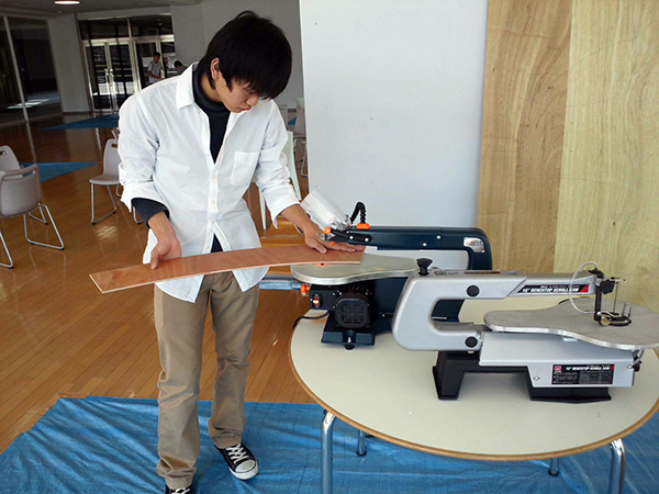 具体的な内容としては、まず縮尺1/5 で模型を作りました。厚さ1mm のスチレンボードを、ベニヤ板の1/5 の寸法である横182mm、縦364mm に切断しました。そこからできるだけ無駄が生じないように、部材のかたどりを検討しました。次に横909mm、縦1,818 mm(サブロクバン)、厚さ5mm のベニヤ板に型紙を当てて部材の形を描く、かたどりをしました。それを電動糸鋸で切り抜き、切断面には紙やすりをかけ部材と部材を接合するスリットを作り、これらの部材を組み立てることによって小さな建築物を建てることができました。