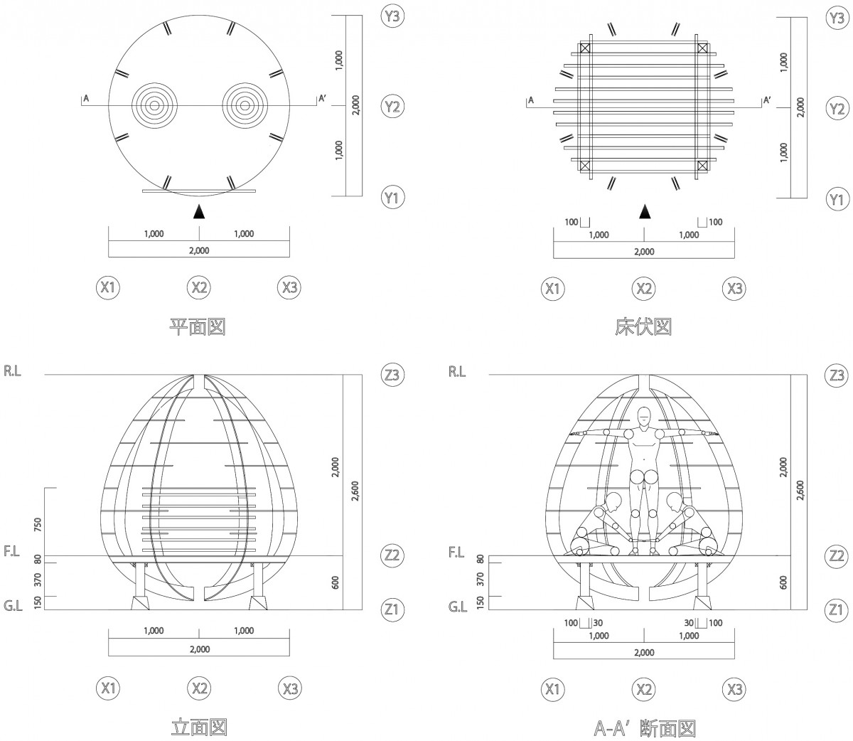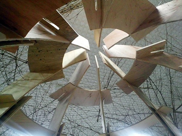 柱は湾曲するベニヤ板16枚による円周上の8か所に配置された重柱です。全て茶室中心に向かうスプライン曲線(与えられた複数の制御点を通る滑らかな曲線)にすることで、全体として卵の輪郭を形成します。さらに柱の外側から7段の円弧状の違い棚をとりつけて、柱の室外への傾倒を相殺されます。外壁には和紙や竹枝を貼ります。