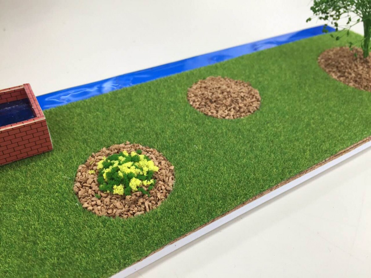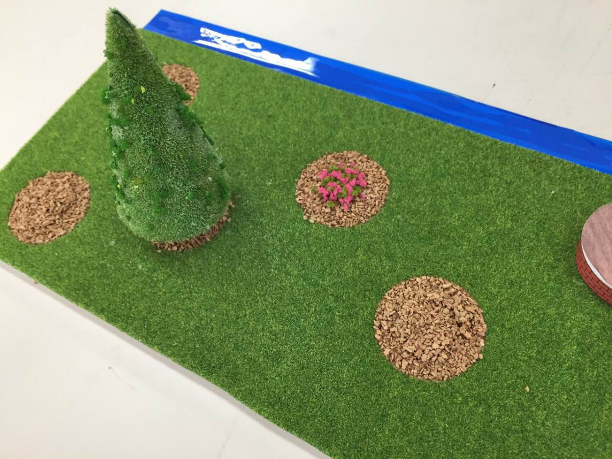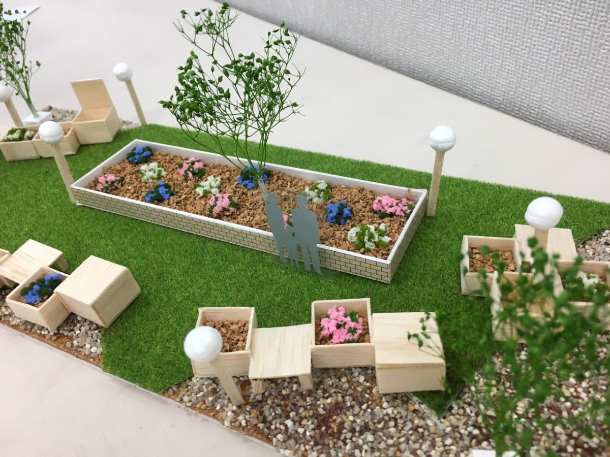 花壇の形をサークル状=円形状)にすることで、どの方向からでも作業できるようにしました。そうすることで、反対側にいる他の人との交流が増えると考えています。またもともと植えてある植木の根元周りも統一性を持たせるために、花壇の形に合わせてサークル状=円形状にしました。ところどころに配置したベンチの形も大きさが違うサークル状=円形状にすることで、一貫性を持たせた空間にしました!