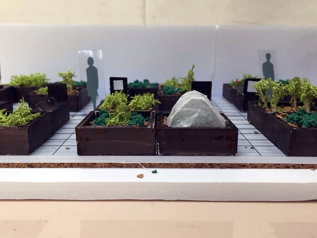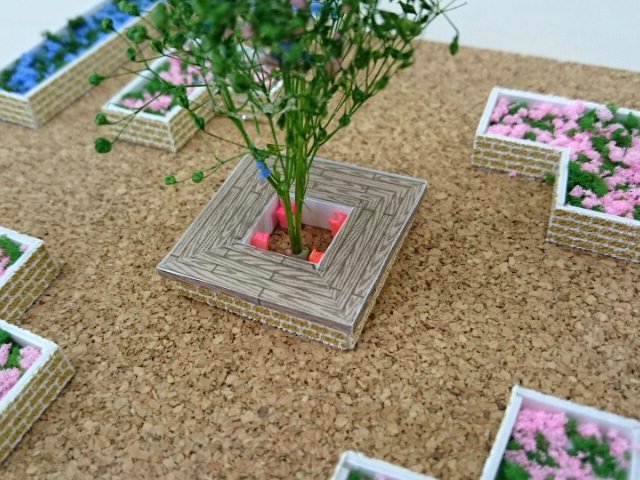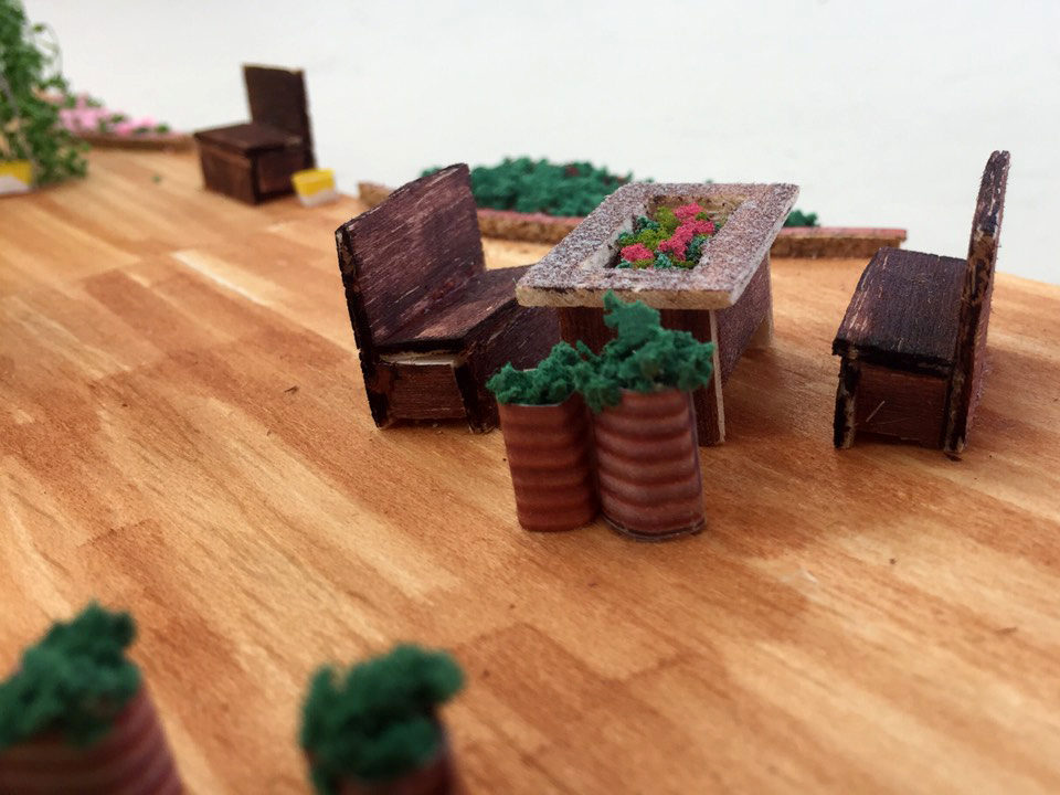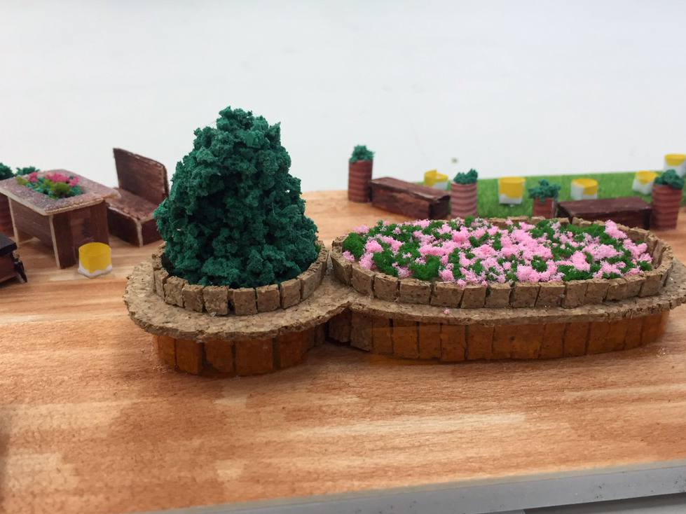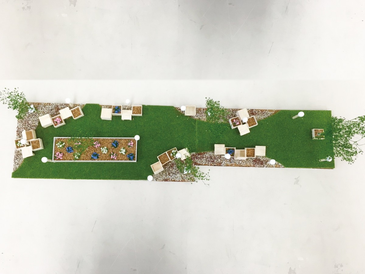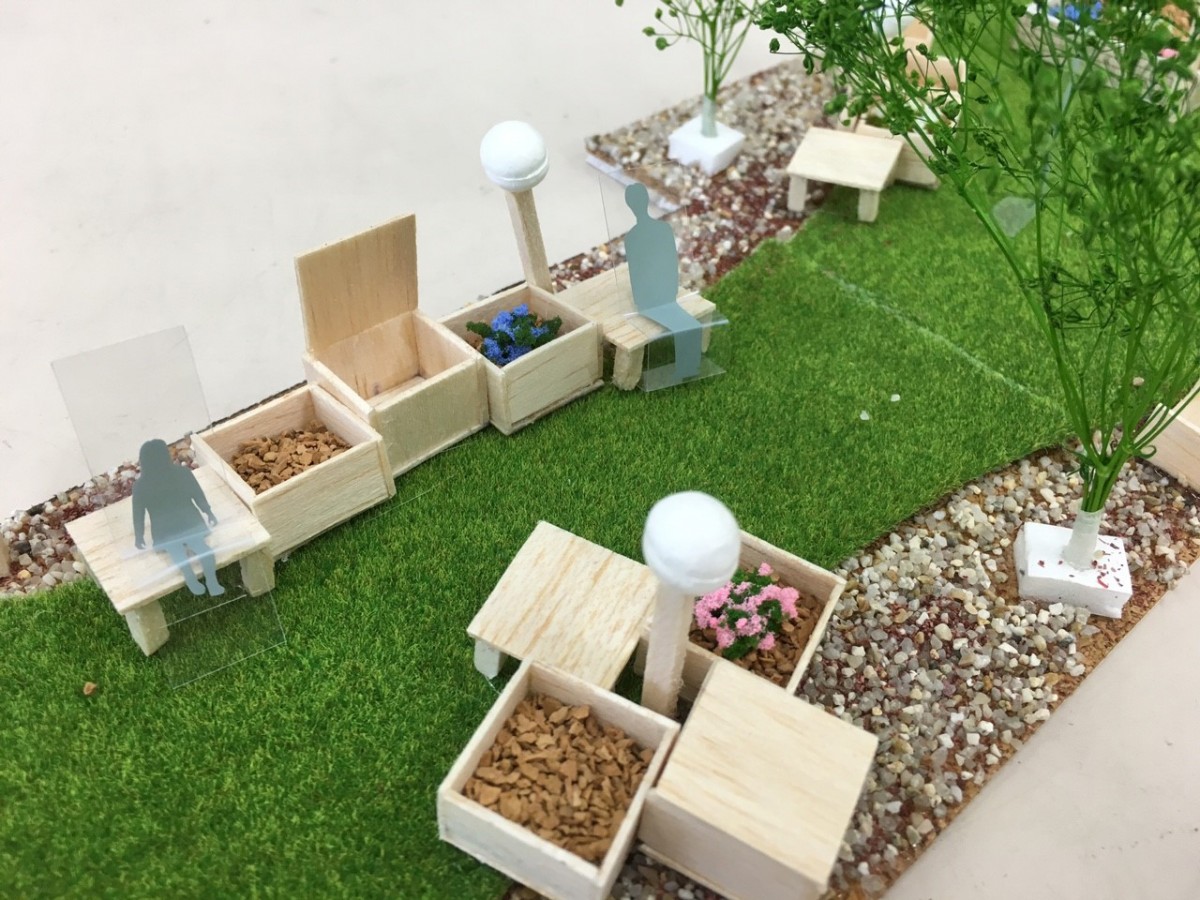 それぞれの畑を一坪で作り、他の人に貸せることを目的としました。一坪の畑をいくつか作ることでより多くのリスナーに足を運んでもらい、手軽に花壇を貸せるようにしました。一坪の畑を左と右にそれぞれ4つずつ人が通れるスペースを確保して、配置することで自由に回遊できる空間を作りました。中央にある円形状の花壇を囲むようにベンチを配置し、目線が花壇の花に向くようにしています。一坪の畑の横にも小さなイスがあり、そのイスは道具を収納できるように作ります。また外を向いて座れるようになっていて、他の人と視線が合わないようになっています。