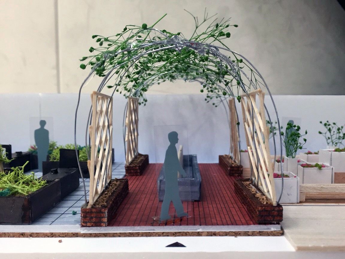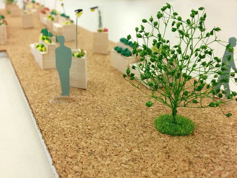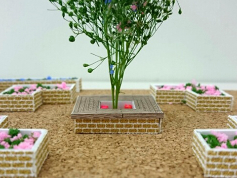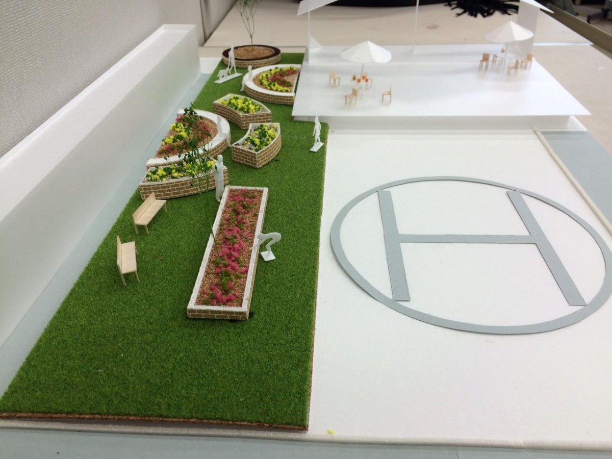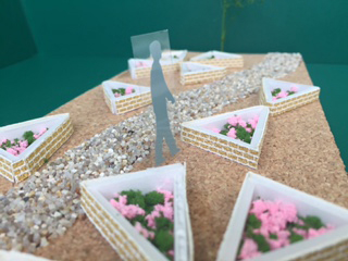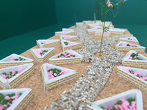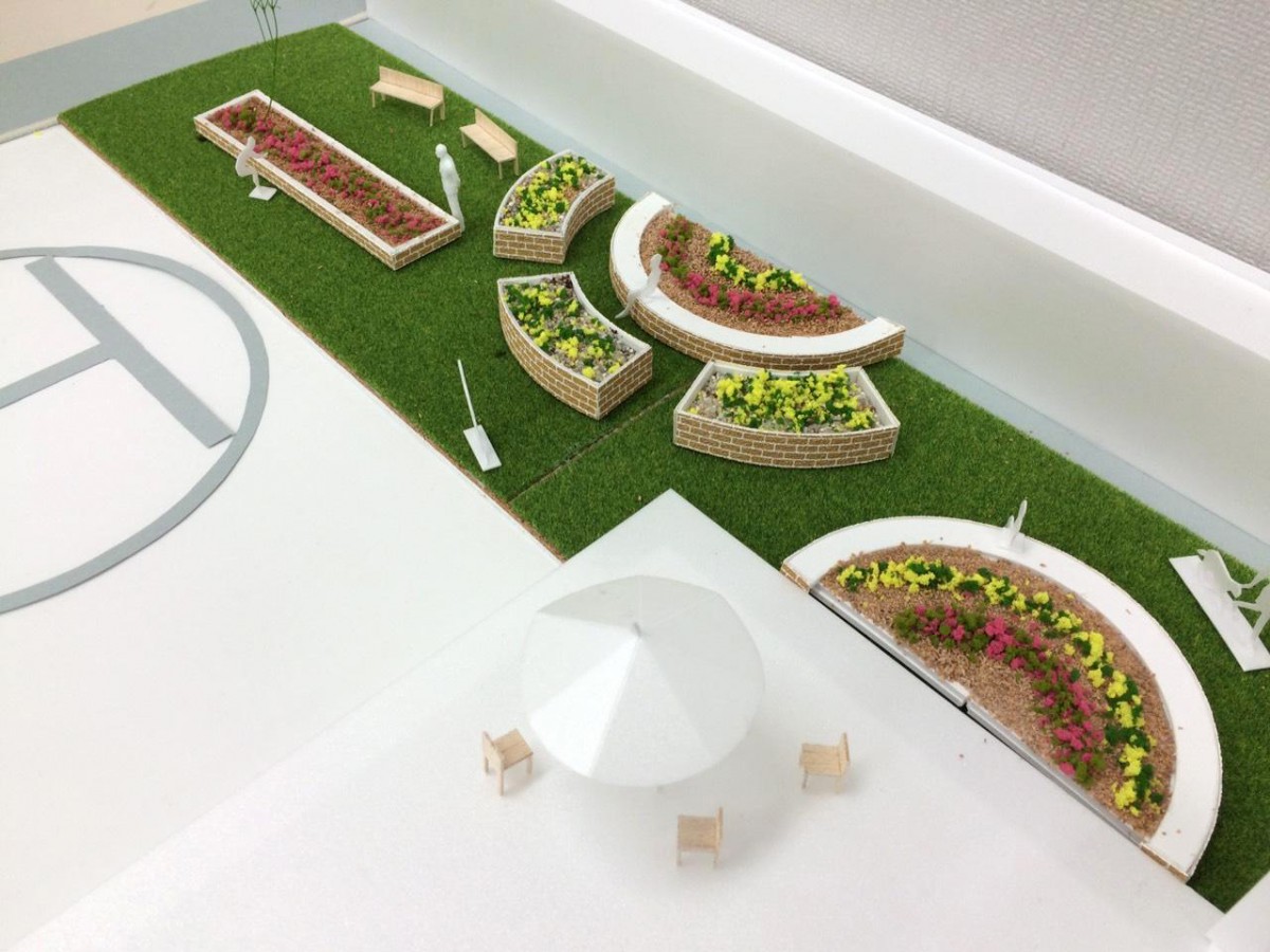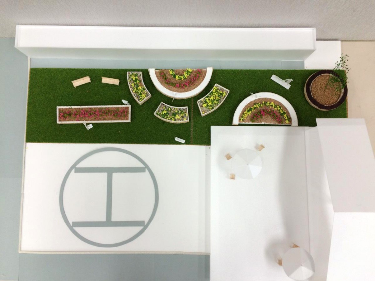 上空から見るとプランターが花の形をしている。なめらかなカーブの通路が花の茎を模しており、そこから花が咲いているように表現しました。