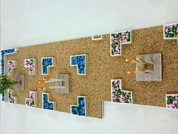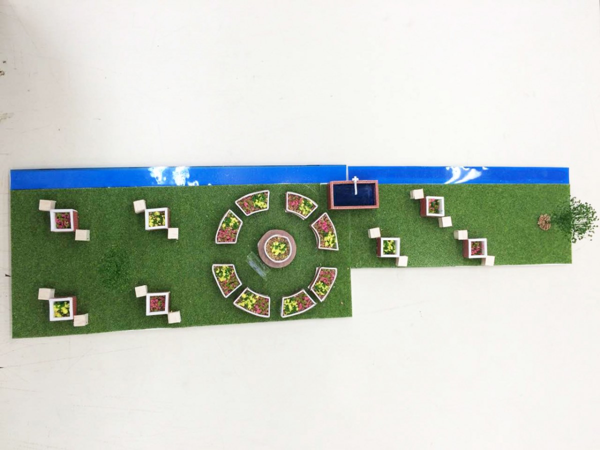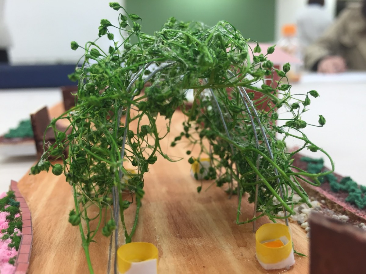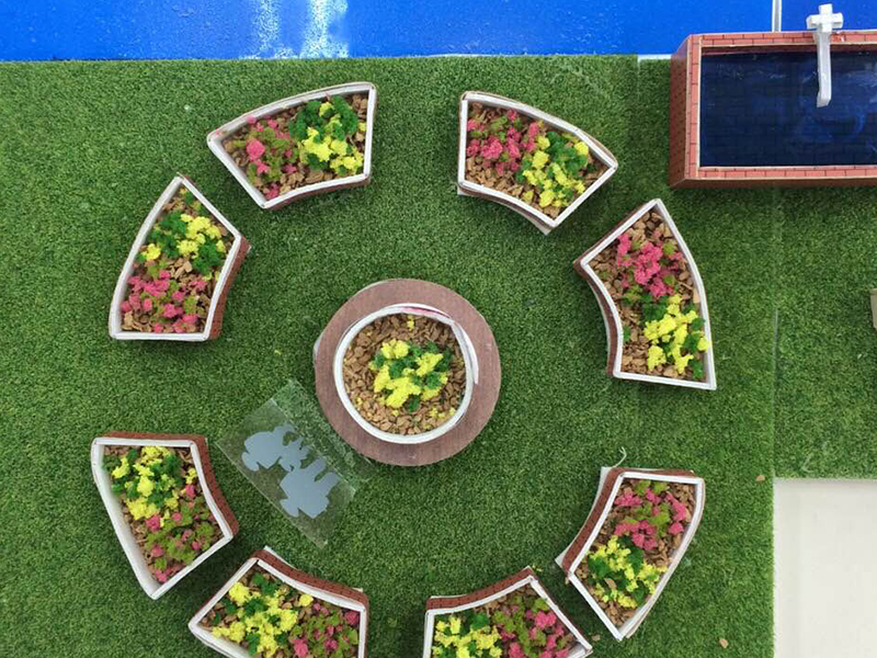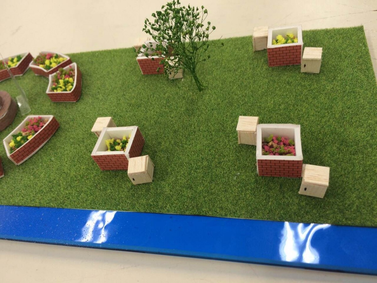 寂しげな屋上に、花の形をした花壇をおいて、かわいく、華やかな雰囲気にしました。花壇の高さを20cmにすることで、小さい子どもやお年寄りも見やすいようになっています。20cmという高さは少し作業がしにくいかもしれませんが、立って見ると菜園全体を見渡すことができ楽しめます。通路をカーブにして、柔らかい雰囲気にすることで、花壇の可愛らしさ、華やかさが壊れないようになっています。花壇の数は全部で40個も設置されているのでたくさんの種類の野菜を植えることができ、1年中を通して多彩な表情をみられようになるでしょう。
