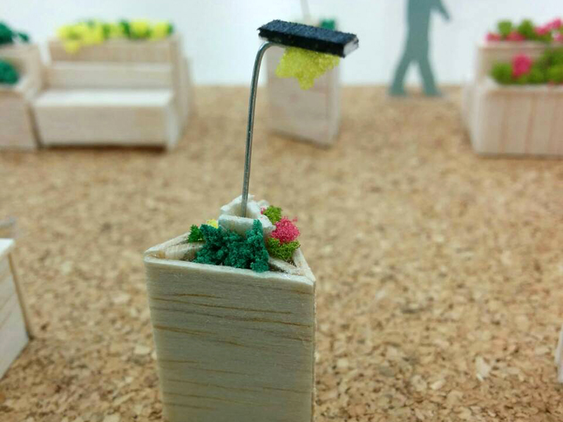 ランダムに配置された三角形のプランターは、3人で使用できるものとなっていて、誰がこの区画の持ち主か分かりやすいように、それぞれに名前を入れたトローチを設置しています。以前は、夜間は少ない照明で作業をしなければならなかったので、プランターを明るく照らせるようにその中心に照明をつけています。このプランでは、cross fm さんが自信をもって、リスナーの方にcross fm ファームを紹介することができるのではないかと思います。そしてファーマーさんのみでなく、一般のお客さんにも楽しんでもらえる空間に、そしてファーマーさんが気持ちよく手入れができるプランターに仕上げました。