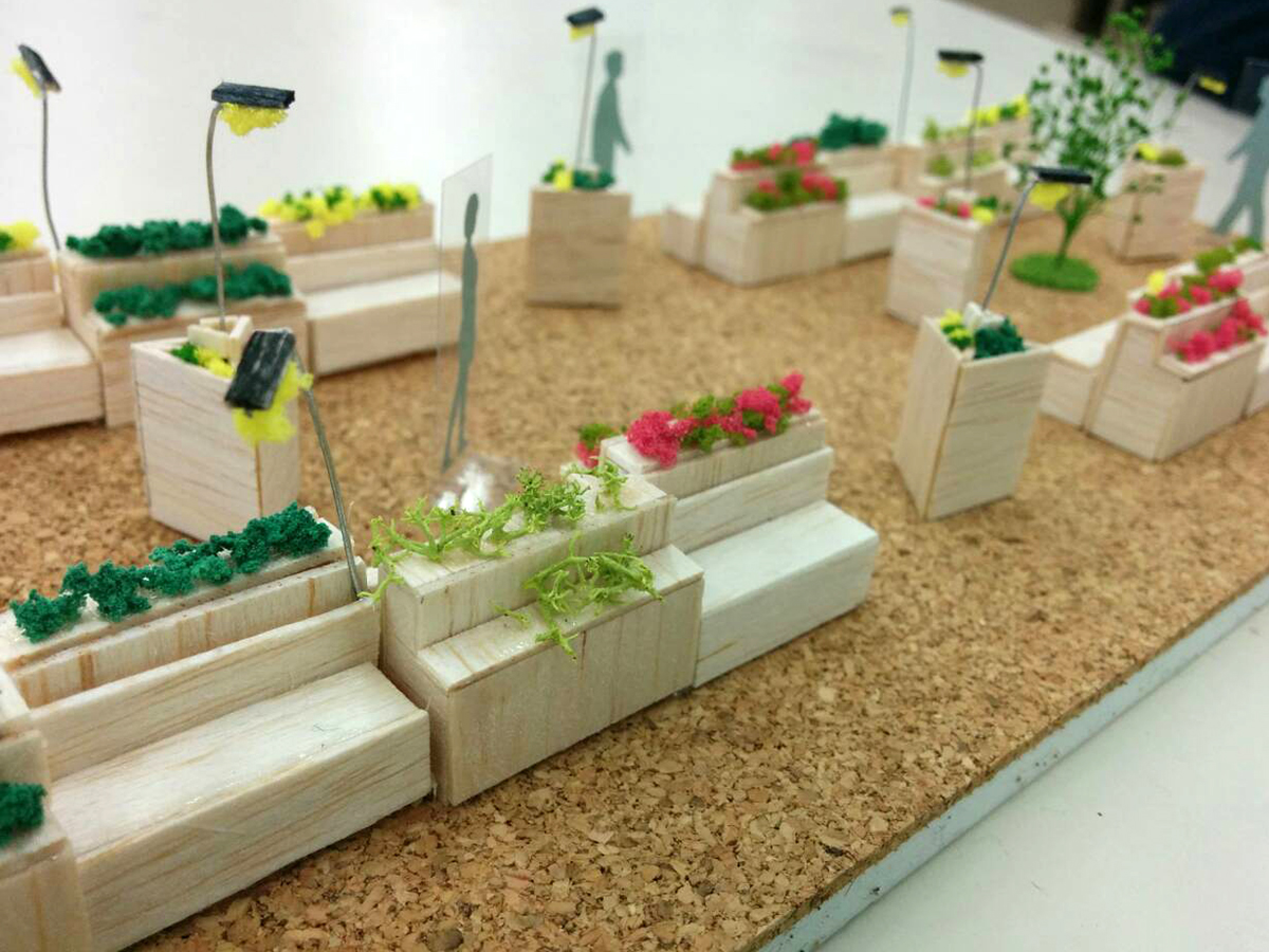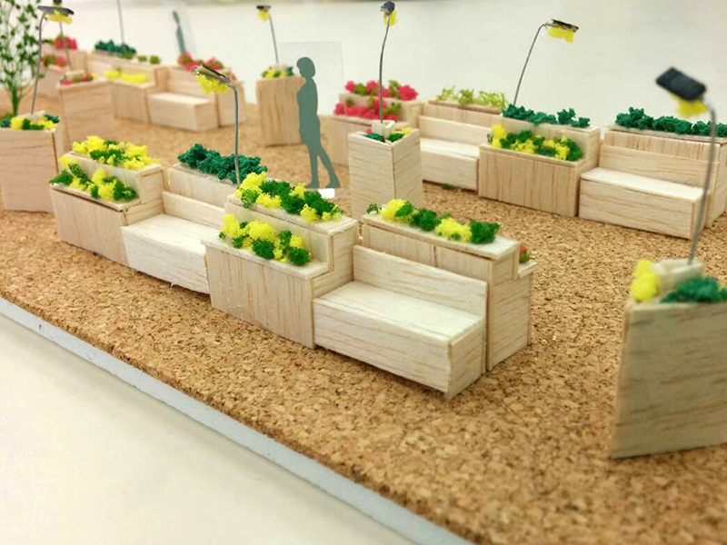 野菜を育てるという目的だけでなく、ファーマーどうしのコミュニケーションも取れるようベンチをおき、楽しみのある空間へと変化させました。花壇は全部で14 個あり、ほぼ同じ形にデザインしています。そのためリスナーへの花壇の貸出がスムーズに行えるはずです。花壇とベンチの高さはともに40cm 程度としており、ベンチに座りながらでも花壇が見えるような高さにしました。また、小さい子どもや車いすの方にも花壇を楽しんでもらうために、この高さに設定しました。