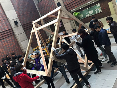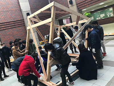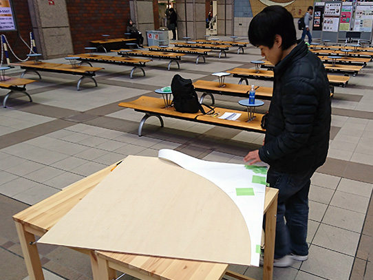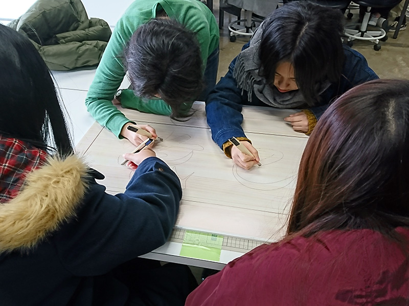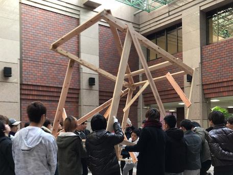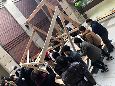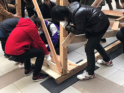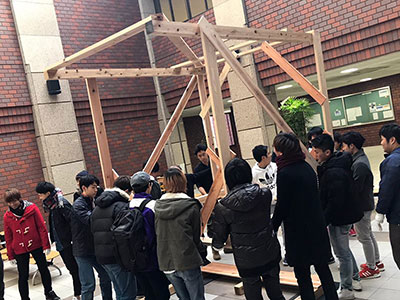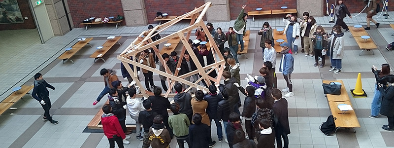 ところで両科目では、多くの履修者が課題を「模様」として模写する傾向があり、正しい図面の読み方の理解や、部材相互の空間的位置関係の把握が不充分でした。ワークショップでは、設計した茶室の実現を通して、図面の正しい読み方を履修者に理解させました。
