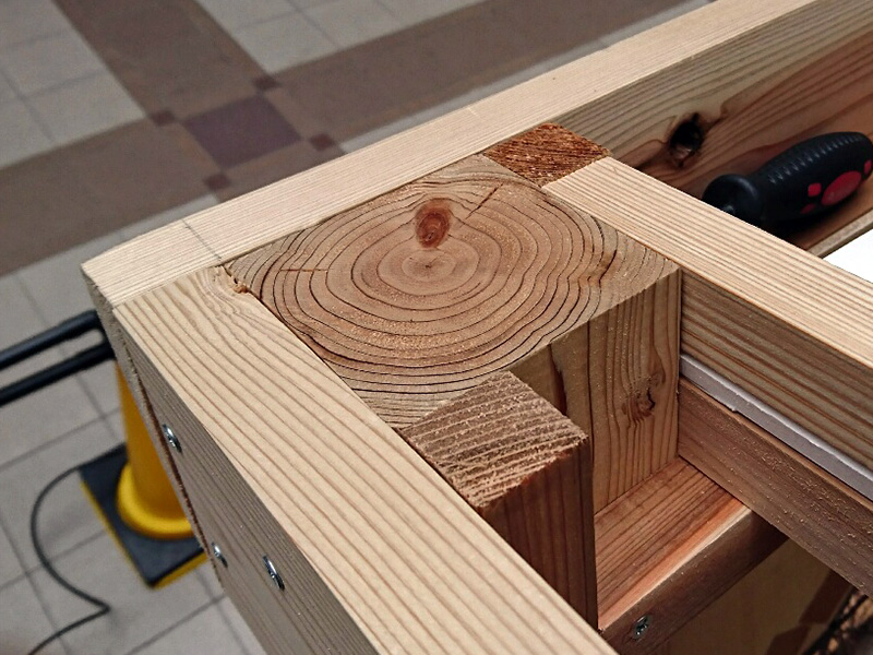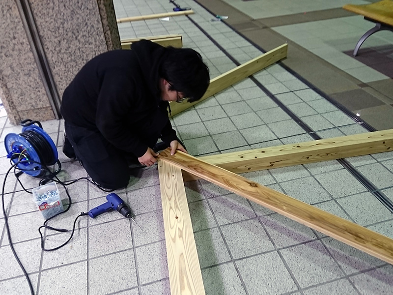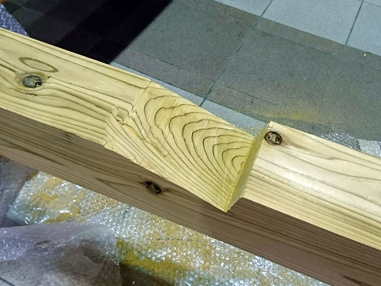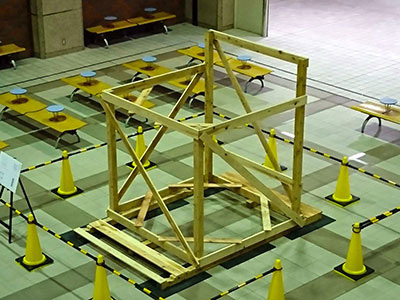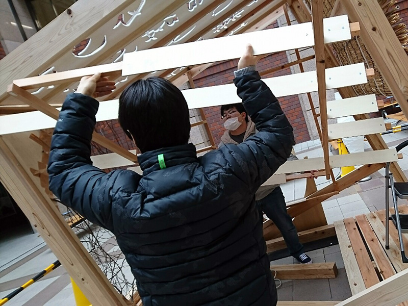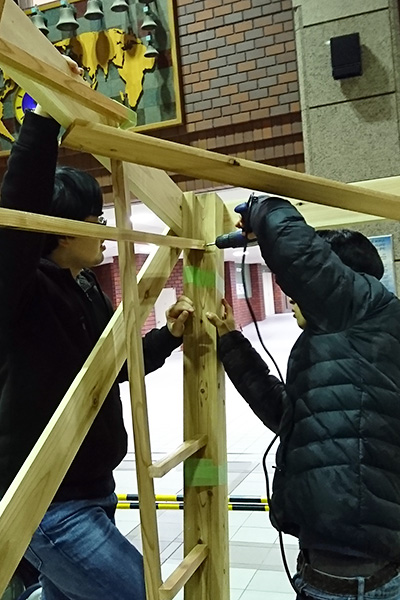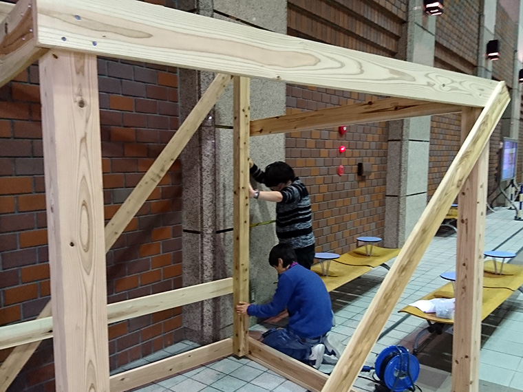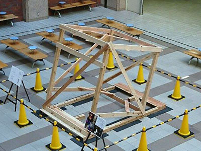 斜めの建築物は部材の寸法が複雑でした。CADで詳細な寸法を測り、正確に部材を加工し、高い精度で組み立てました。上下を反転させ、土台に固定する作業もぴったり成功しました。