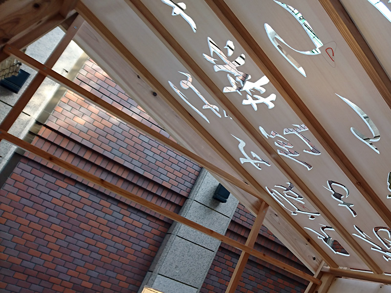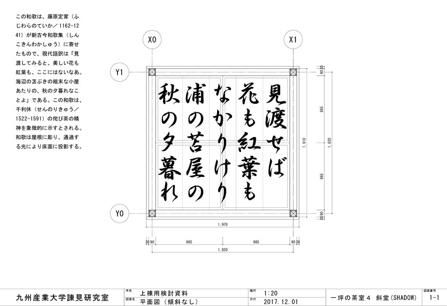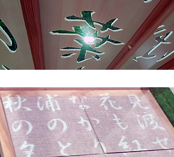 天井は和歌の文字が切り取られています。天井の影(そこを通過する光)により和歌が床面に映り込み、一坪の茶室4「斜堂(SHADOW)」の内部空間を演出します。