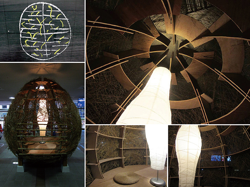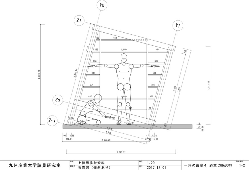一坪の茶室4「斜堂(SHADOW)」は名前どおり、斜めの建築物です。施工難度を軽減するため、まず上下を逆にして、梁と柱を水平・垂直の状態を保持して組み立てました。その後165°回転させて土台に固定しました。