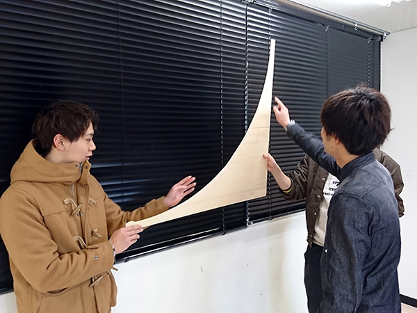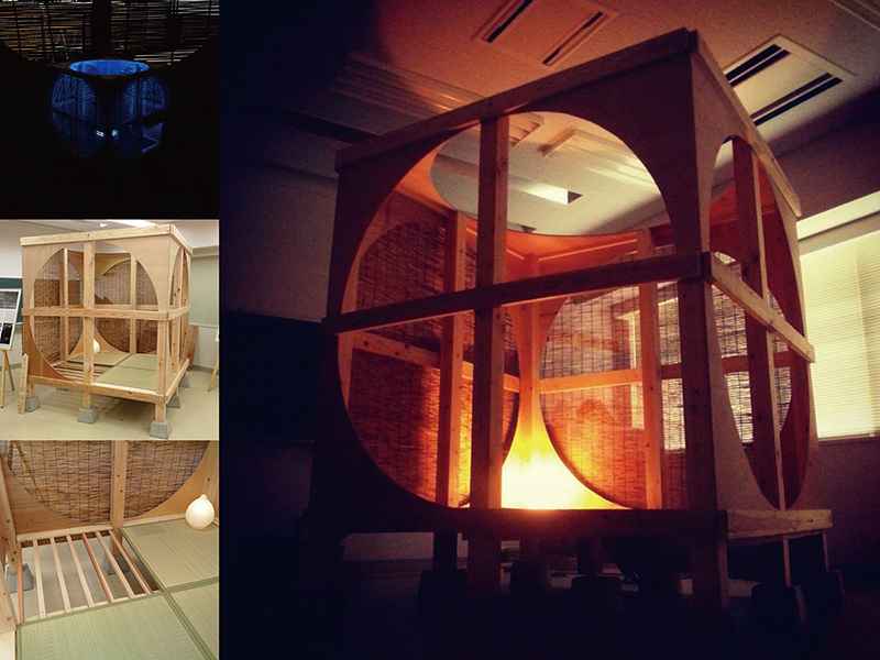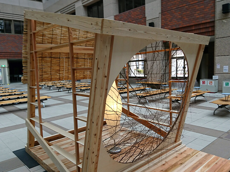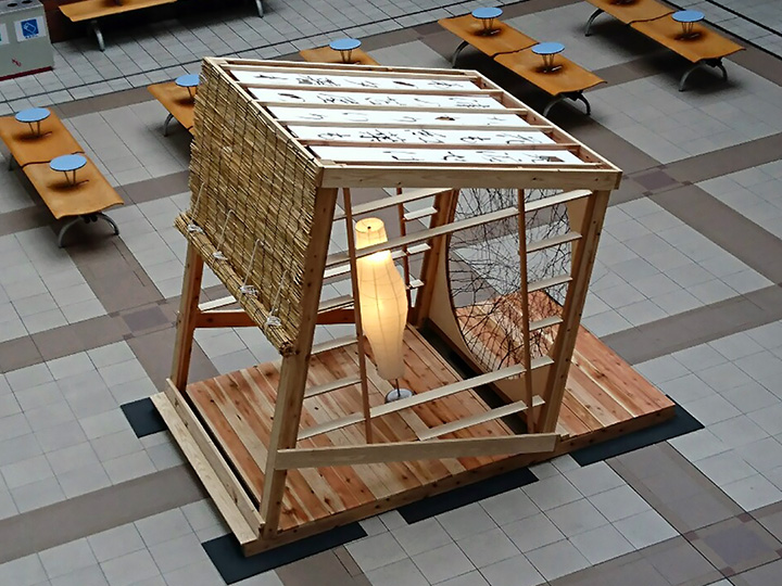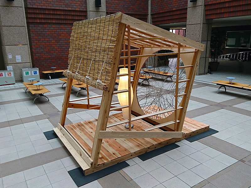 住居・インテリア設計学科2年生の私たちは、一坪の茶室4「斜堂(SHADOW)」を設計し、「たてものがかりワークショップ」として、科目「CAD実習」・科目「製図実習」を履修する1年生や、体験入学の高校生と製作しました。