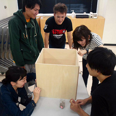私たちが設計した箱は、400mm×400mm×400mの1面だけ空いた立方体で、厚さ9mmのシナベニ合板5枚を12本のビスで止めるものです。この箱は、人が座ったときにちょうど良い高さであり、A4サイズの本などがすっぽり入る大きさになっています。私たちは日本学術振興会(ひらめき・ときめきサイエンス)からの助成を受け、箱を80個製作することにしました。