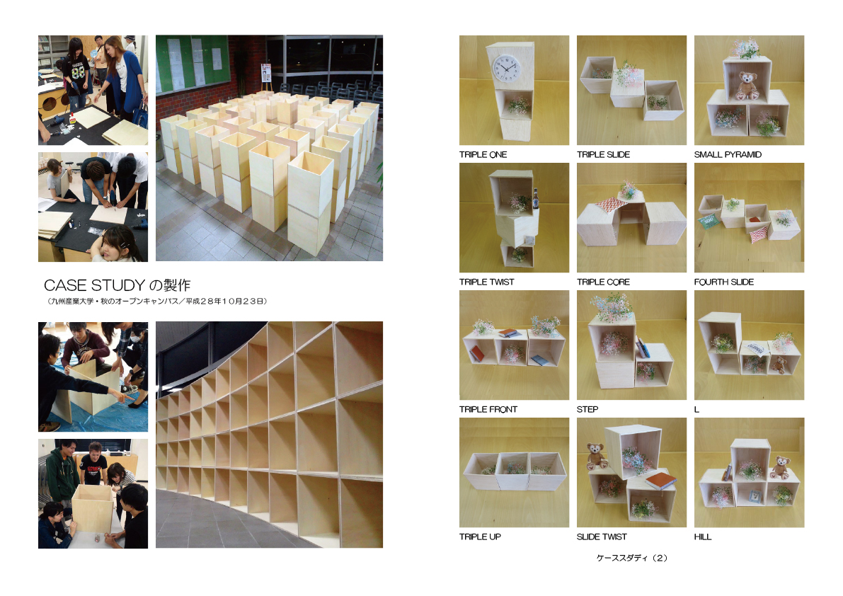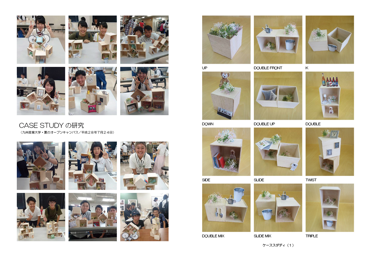 昨年12月、私たちがフラワーアレンジメントスクール・リーズガーデン(北九州市小倉北区)から、同スクールの作品展で使用する展示装置の設計・製作を依頼されたことが、この活動のきっかけです。そこで私たちは、持ち運びが容易で簡単にたくさん作れる展示装置とすることを目的に、立方体の箱(CASE:ケース)を設計して、模型を使って展示方法を研究(STUDY:スタディ)し、その成果として展示装置の実物を製作・納品することにしました。
