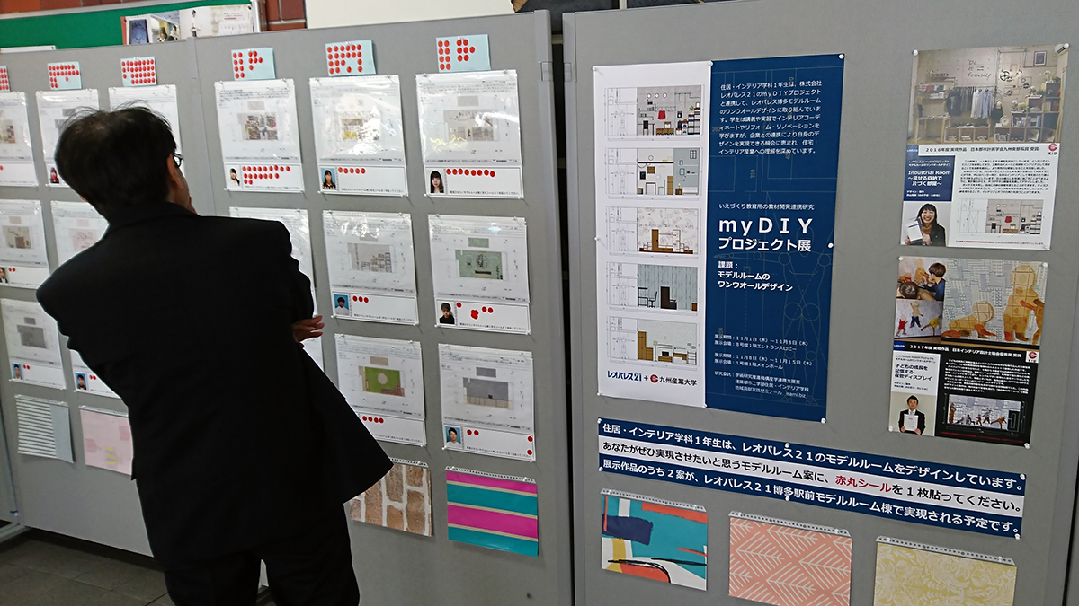住居・インテリア学科1年生は、株式会社レオパレス21のmyDIYプロジェクトと連携して、 レオパレス博多駅前モデルルーム棟のワンウオールデザインに取り組んでいます。学生は講義や実習でインテリアコーディネートやリフォーム・リノベーションを学びますが、 企業との連携により自身のデザインを実現できる機会に恵まれ、 住宅・インテリア産業への理解を深めました。また本学学園祭期間、レオパレス21+九州産業大学myDIYプロジェクト展を開催しました。