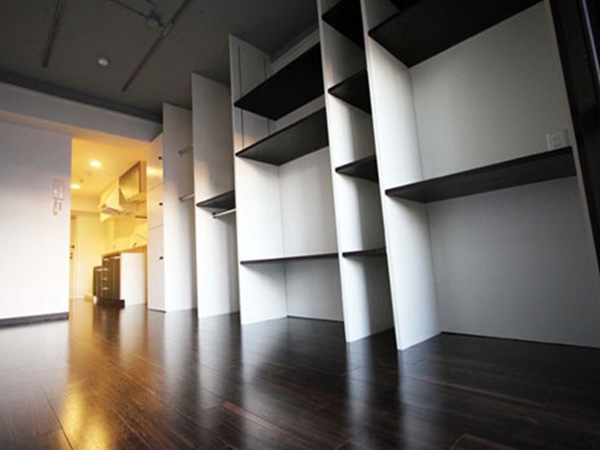 本プロジェクトでは、三好不動産スマイルデザインプロジェクトと連携し、学生によるマンションリノベーションの設計と工事監理を行いました。作品「Display Style」では、基本的に物はすべてインテリアとして露出しています。しかし他人に見られたくない物もありますので、棚の一部に扉を設置してプライバシーを保護しました。作品ではホテルの一室にいるような、玄関から部屋まで仕切る物のない落ち着いた空間を念頭に、キッチンと部屋を区切るドアをなくしたことで、他のワンルームとの差別化を図りました。作品は、日本建築仕上学会学生研究奨励賞を受賞しました。